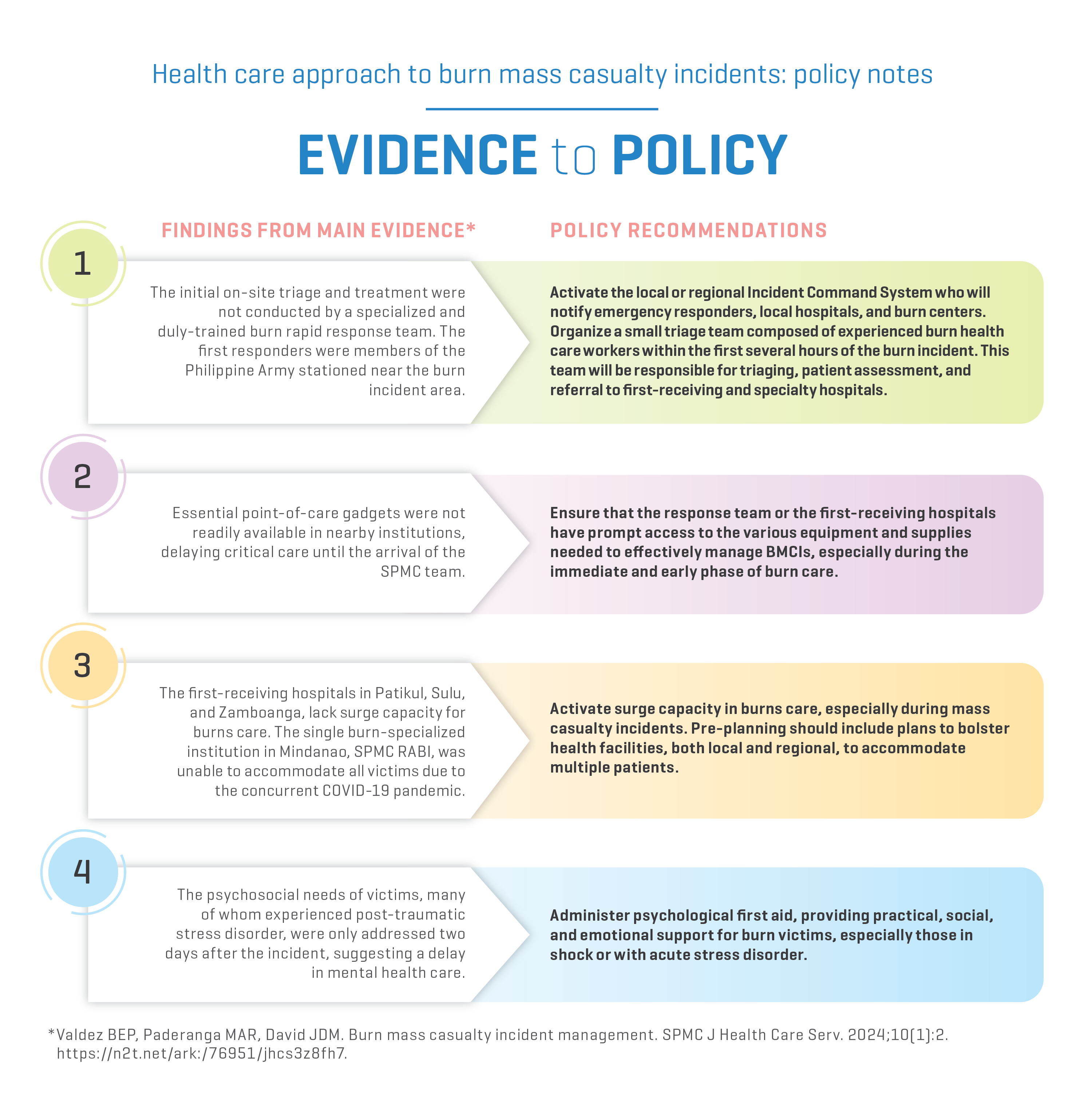 Cite as Valdez BEP, Paderanga MAR, David JDM, Perandos-Astudillo CM, Roño RC. Health care approach to burn mass casualty incidents: policy notes. SPMC J Health Care Serv. 2024;10(1):5. https://n2t.net/ark:/76951/jhcs2g3q4f