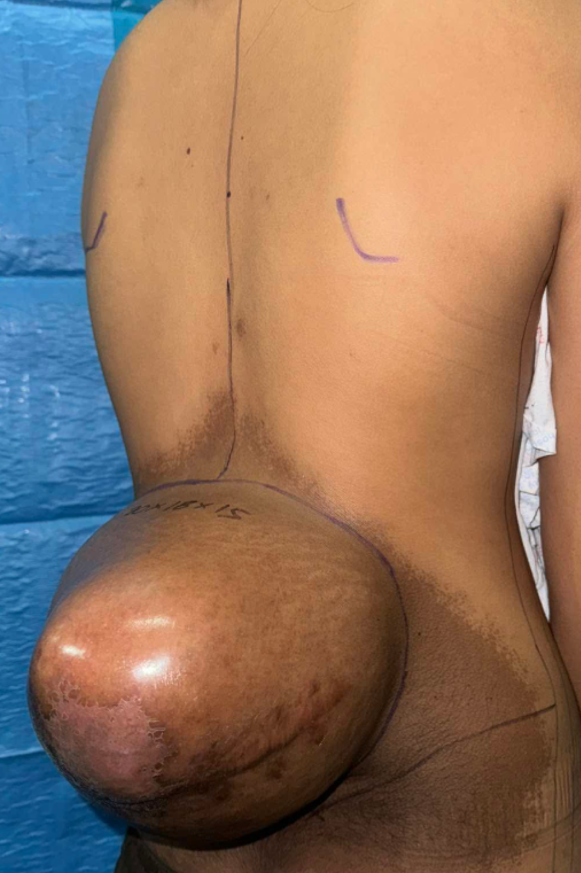 At birth, the patient was noted to have a hyperpigmented patch over the lower back. Approximately three years prior to the current admission, a mass measuring about 1 cm developed at the same site and gradually increased in size. Four months before admission, the mass rapidly enlarged to approximately 7 cm, prompting medical consultation. An initial ultrasound demonstrated a fluid-filled vascular mass, and subsequent biopsy revealed a spindle cell neoplasm. One month prior to admission, the patient consulted a private spine surgeon who obtained magnetic resonance imaging (MRI) of the thoracolumbar spine, which showed an encapsulated, skin-covered, complex cystic soft tissue mass in the posterior lumbar region. Based on the MRI findings and biopsy results, the patient was initially diagnosed with a spindle cell neoplasm and was advised to undergo immediate surgical intervention. Due to financial constraints, she was referred to the Orthopedic Service of our institution, where a wide resection of the lumbar mass with soft tissue reconstruction was planned. The patient denied lower extremity weakness or paresthesia. There was no family history of similar hyperpigmented lesions or masses, and she had no history of radiation exposure.On physical examination, a well-demarcated cystic mass measuring approximately 14 × 14 × 8 cm was observed over the lower back (Figure 1). The mass was soft, non-tender, and non-erythematous, with no evidence of discharge or necrosis, though a transverse incision scar from a prior biopsy was present. An overlying hyperpigmented patch with irregular borders extended from the thoracolumbar region to the superior gluteal area and contained sparse superficial hair. No café-au-lait macules were identified. The rest of the physical examination findings were unremarkable. Based on the patient’s clinical history and examination findings, a spindle cell neoplasm was initially suspected.