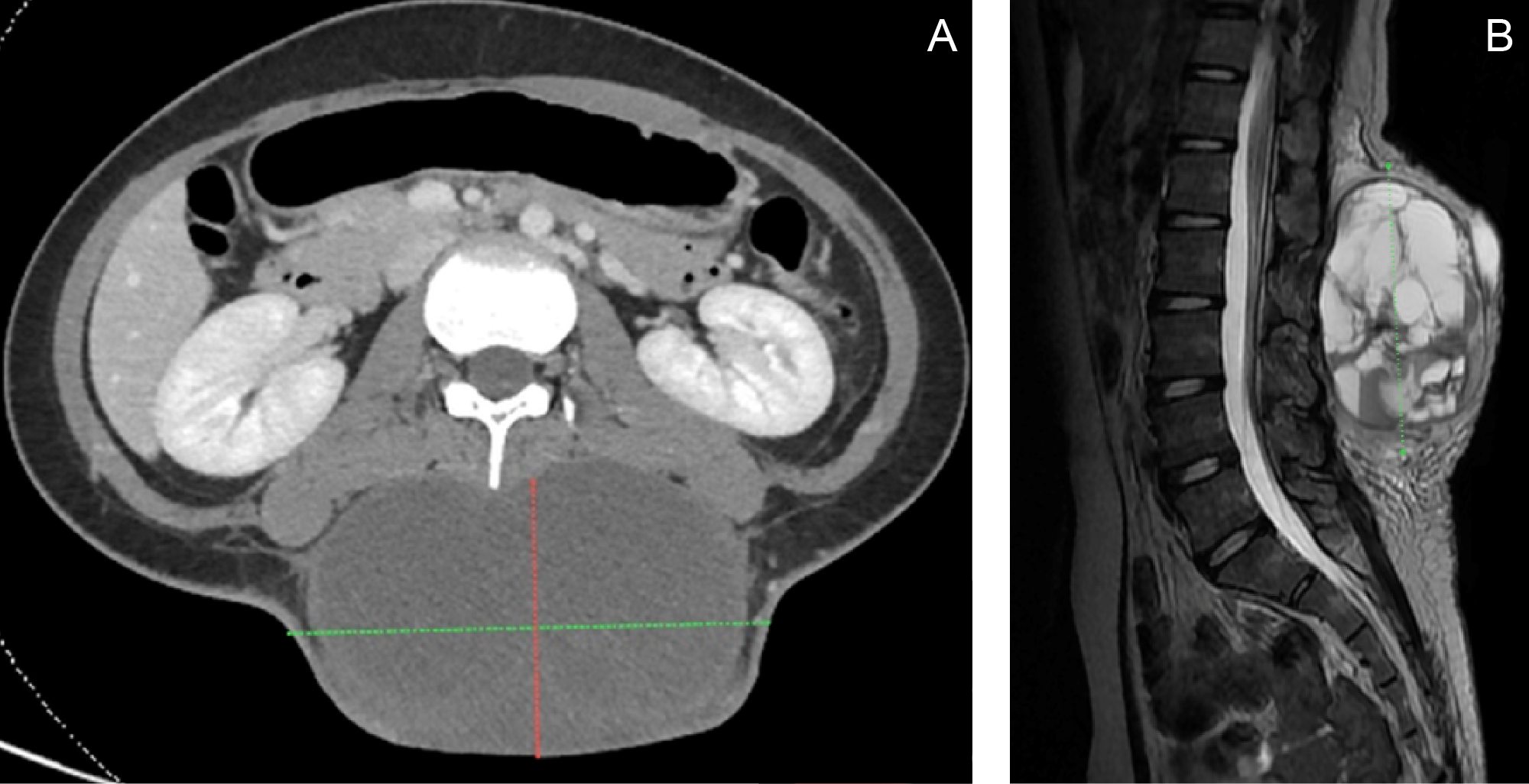A CT scan and MRI prior to admission revealed an encapsulated, skin-covered, complex cystic soft tissue mass measuring 11.14 × 4.2 × 12.03 cm in the posterior lumbar region, extending from L1 to L5, without evidence of spinal extension (Figure 2). The imaging characteristics demonstrated overlapping features with plexiform neurofibromas, contributing to diagnostic uncertainty.The patient was initially admitted under the Orthopedic Service. On admission, chest and lumbosacral spine imaging confirmed the posterior lumbar mass and additionally revealed intervertebral disc disease at L2–L4, with possible anterolisthesis at L2–L3. She was subsequently referred to Pediatric Oncology and Dermatology for multidisciplinary comanagement. Dermatologic evaluation identified a congenital melanocytic nevus corresponding to the hyperpigmented patch present since birth. The patient was also referred to Plastic and Reconstructive Surgery for planning of soft tissue reconstruction.