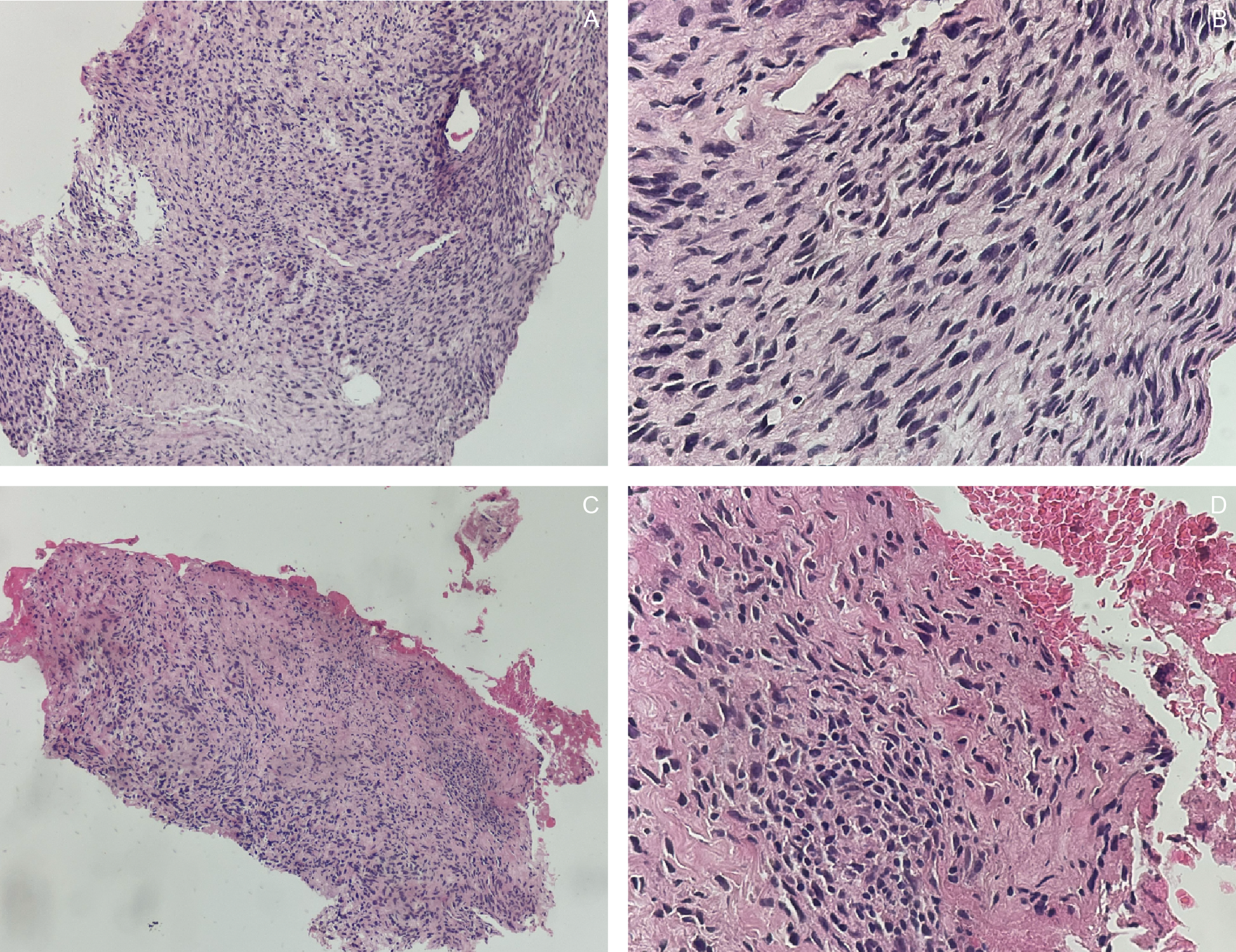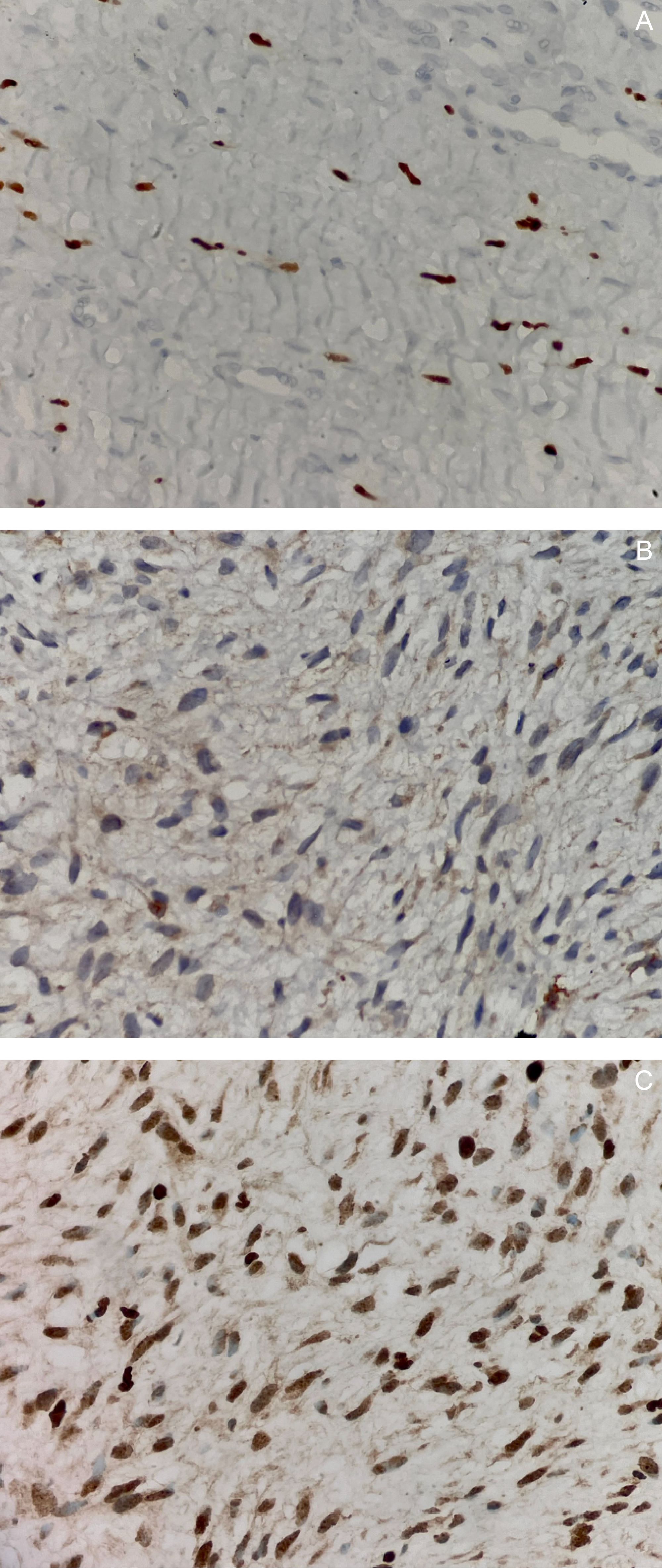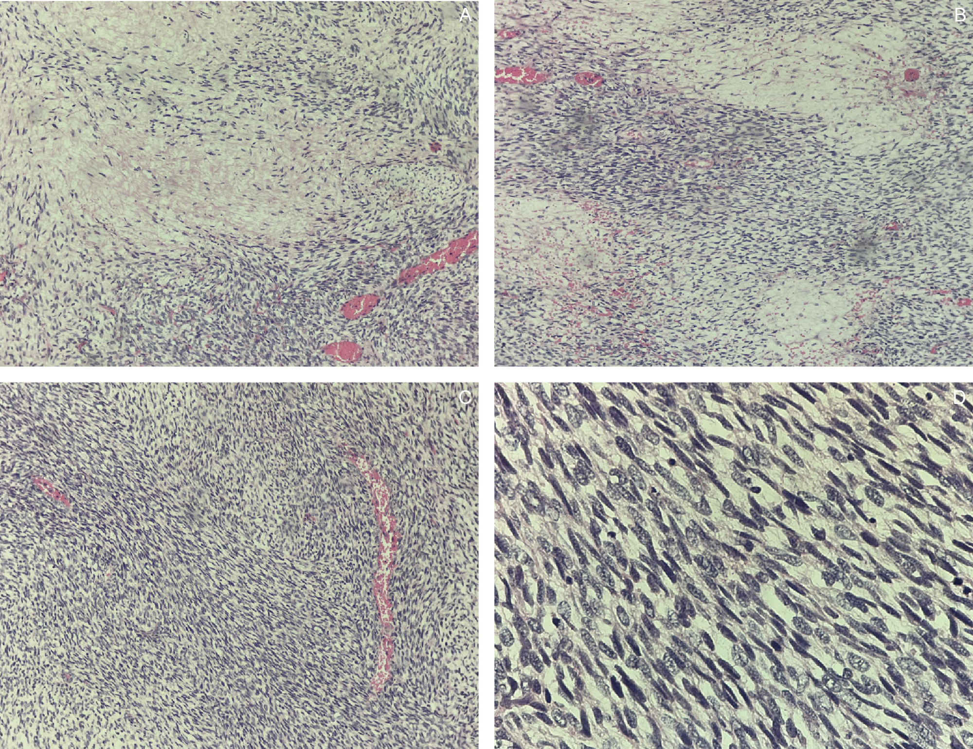An ultrasound-guided core needle biopsy with frozen section demonstrated spindle cells with bland nuclear features, indistinct cytoplasm, inconspicuous nucleoli, focal necrosis, and rare mitotic figures. Histopathologic findings were consistent with a spindle cell sarcoma of the lower back (Figure 3). Immunohistochemical (IHC) staining showed positivity for S100, TLE-1, and CD34, supporting the diagnosis of a nerve sheath tumor (Figure 4).