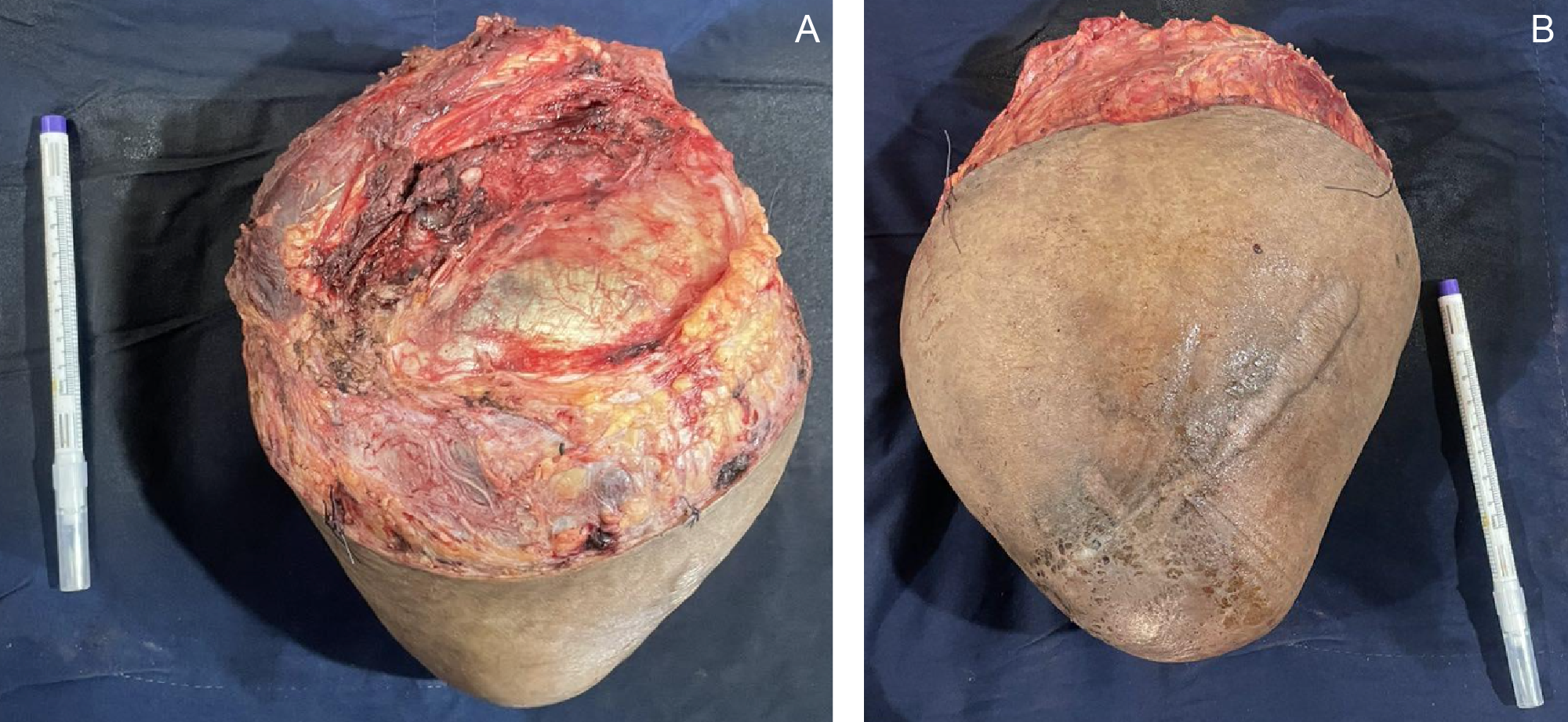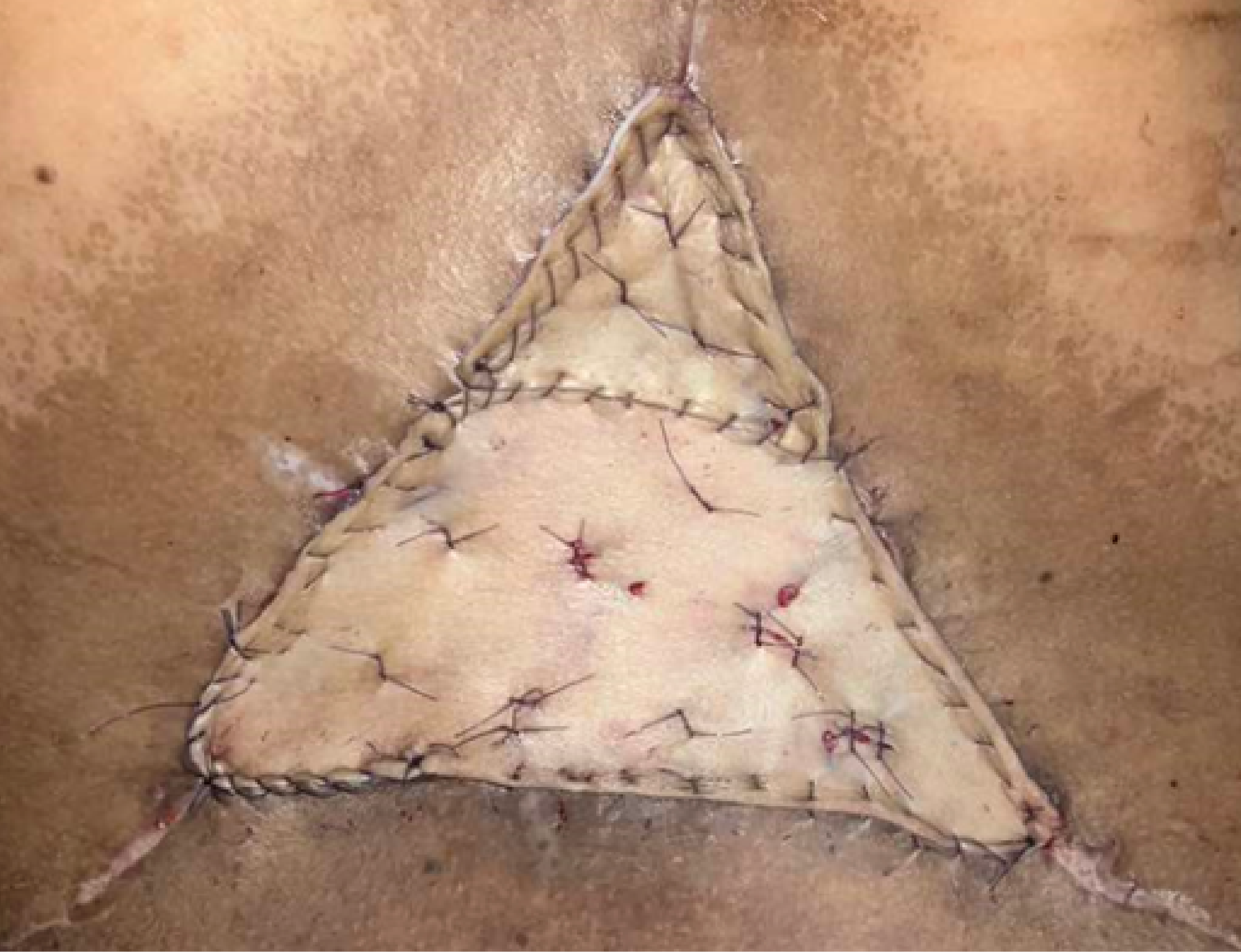 The patient was subsequently readmitted for definitive surgical management and underwent wide tumor resection of the lumbar mass with intraoperative frozen section biopsy. Postoperatively, she developed a surgical site infection complicated by wound dehiscence and febrile episodes. Broad-spectrum intravenous antibiotics, including vancomycin, meropenem, and ciprofloxacin, were initiated. Wound cultures yielded Candida albicans and Acinetobacter baumannii, prompting the addition of intravenous fluconazole and colistin while continuing prior antibiotics. The infection was managed with surgical debridement and two cycles of vacuum-assisted closure therapy, followed by placement of a full-thickness skin graft harvested from the bilateral gluteal folds (Figure 9). After resolution of the infection, the patient was discharged and later readmitted for adjuvant chemotherapy.