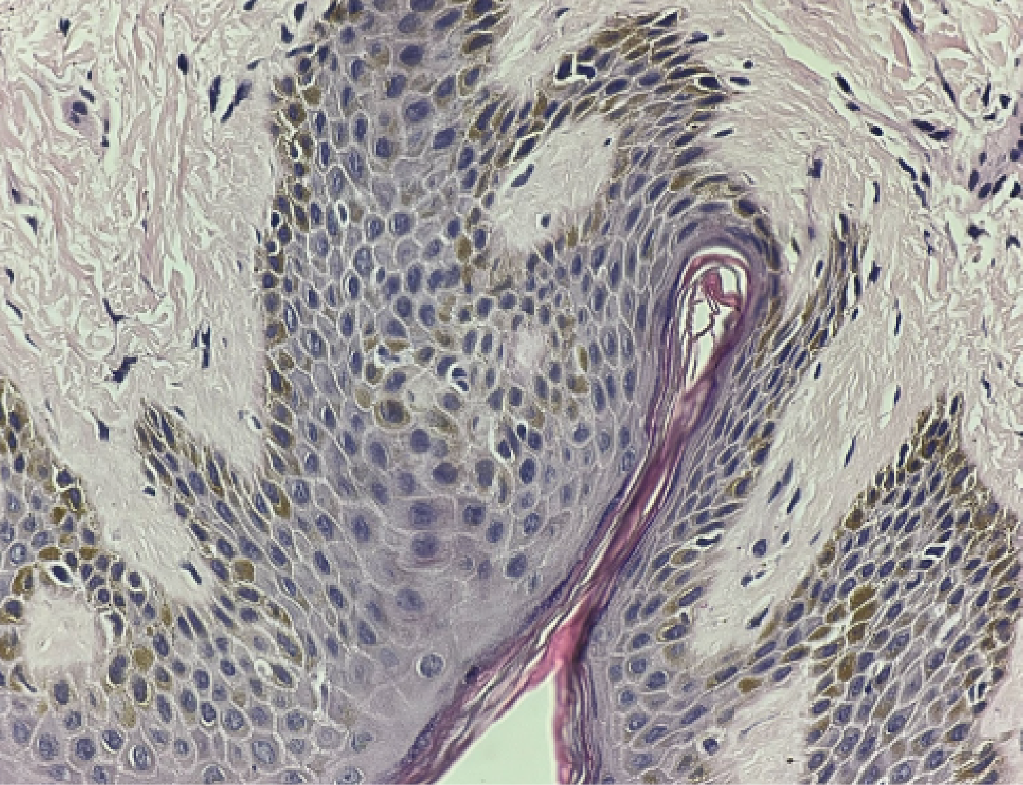 The hyperpigmented patch was further evaluated by Pediatric Dermatology to assess for neurofibromatosis type 1 (NF1). Histologic analysis revealed keratinocyte hyperpigmentation without atypical cells (Figure 8), a finding that may be seen in NF1; however, in the absence of other clinical manifestations, the lesion was classified as a giant congenital melanocytic nevus. Genetic testing was recommended to definitively exclude NF1. The patient was discharged with a final diagnosis of MPNST arising in association with a giant congenital melanocytic nevus. Comprehensive counseling was provided by the Pediatric Oncology Service regarding chemotherapy goals, potential adverse effects, and the risk of recurrence or metastasis. The Orthopedic and Plastic Surgery teams also provided detailed postoperative wound and graft care instructions.