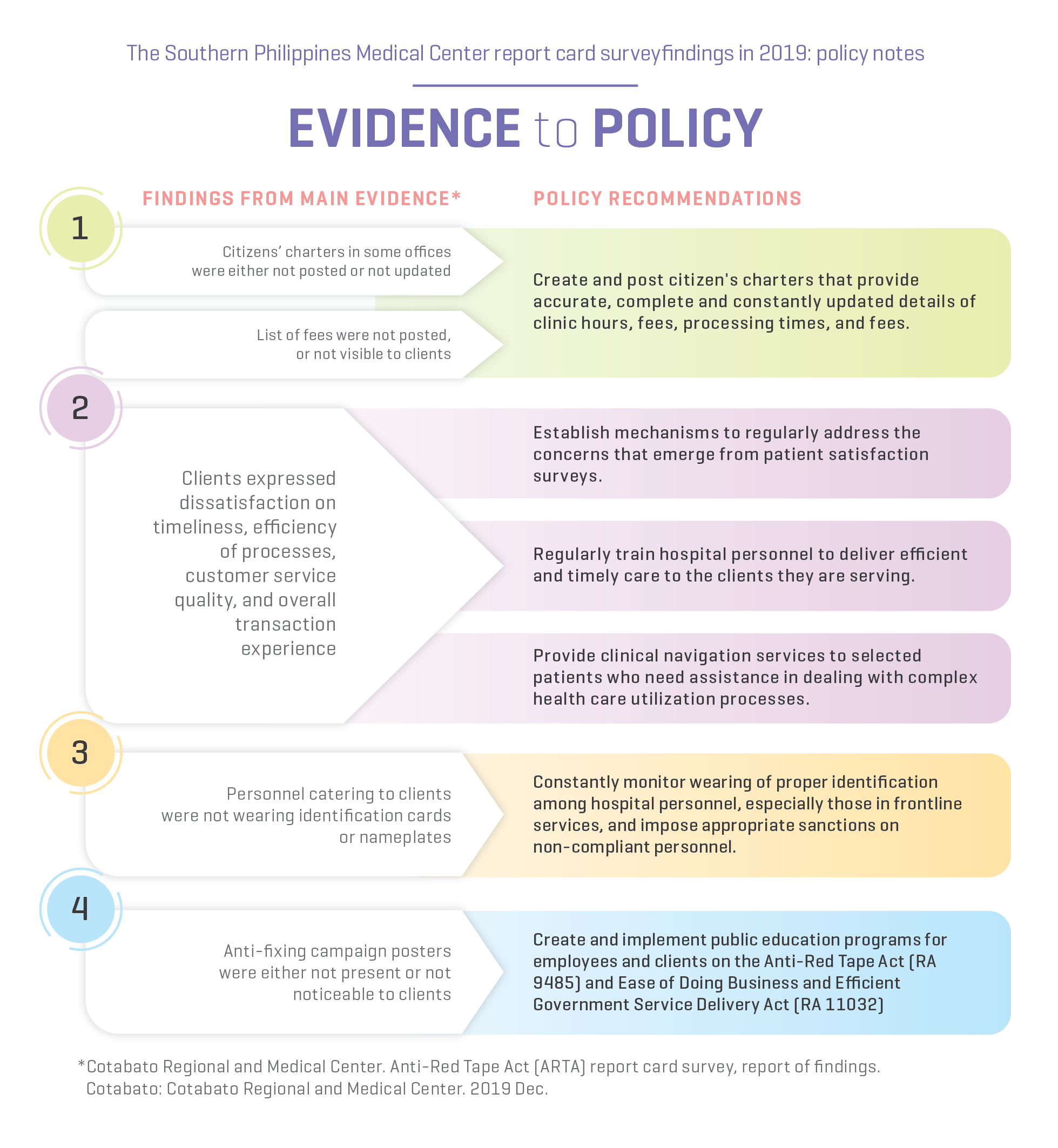 8 The designated researcher used two instruments—an inspection checklist (IC) and a survey questionnaire (SQ)—during the survey to measure ‘compliance with ARTA provisions’ and ‘overall client satisfaction’ in SPMC. The IC was used to record the researcher’s objective observations in SPMC that pertain to the subareas in both core areas of the survey. The researcher’s IC rating accounted for 20% of the final RCS score. The SQ, which accounted for 80% of the final RCS score, was used as an interview guide for the clients to assess all subareas from the perspective of the clients. During the survey period, a total of 30 clients were interviewed. In 2019, the SPMC RCS final score was 82.63 (Good) out of a perfect score of 100. The descriptive findings from the study and the corresponding policy recommendations are outlined in the evidence-to-policy diagram.