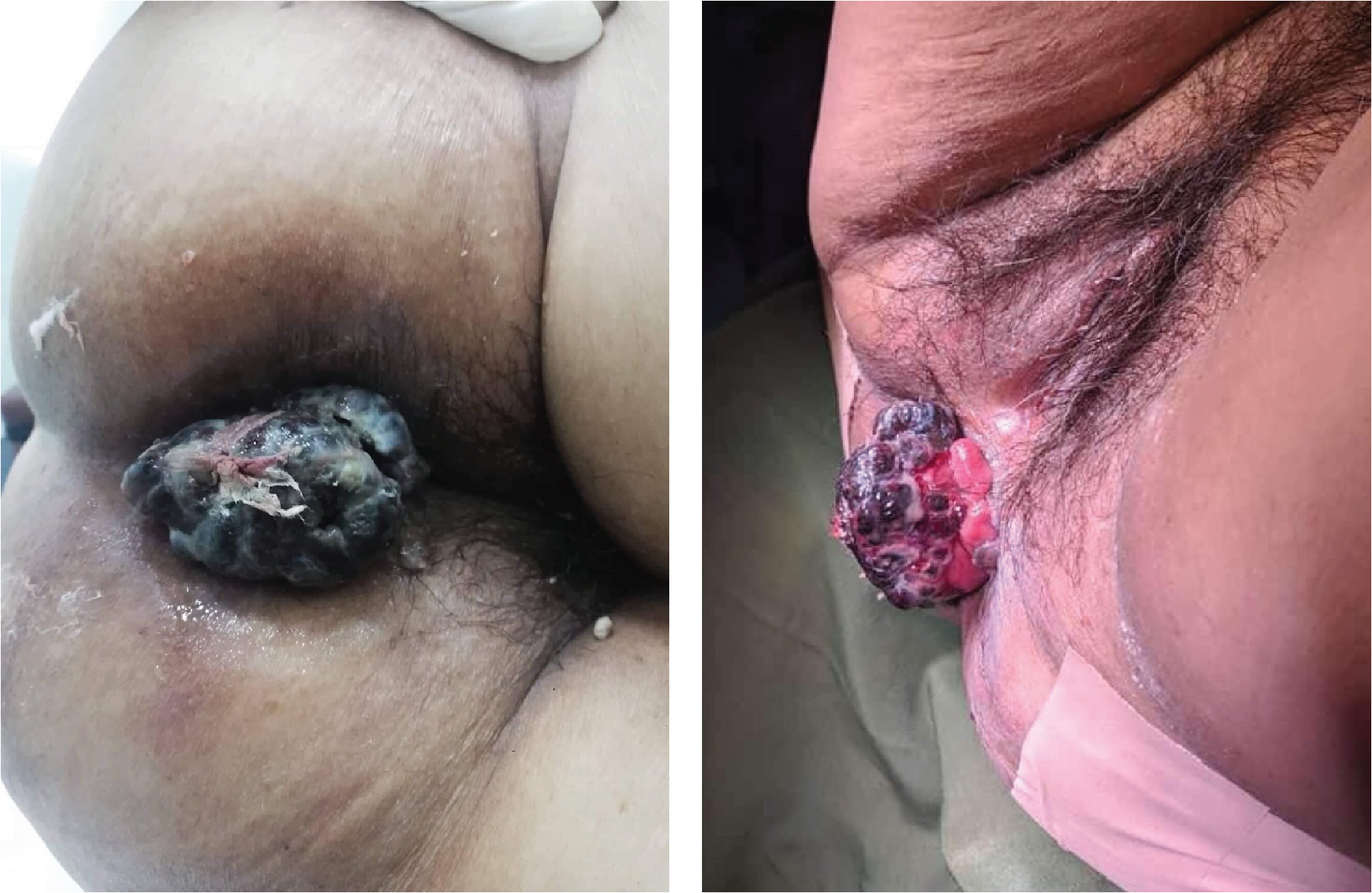 A 6 x 7 x 6 cm black, fungating, pedunculated, non-tender mass located within the anal orifice.