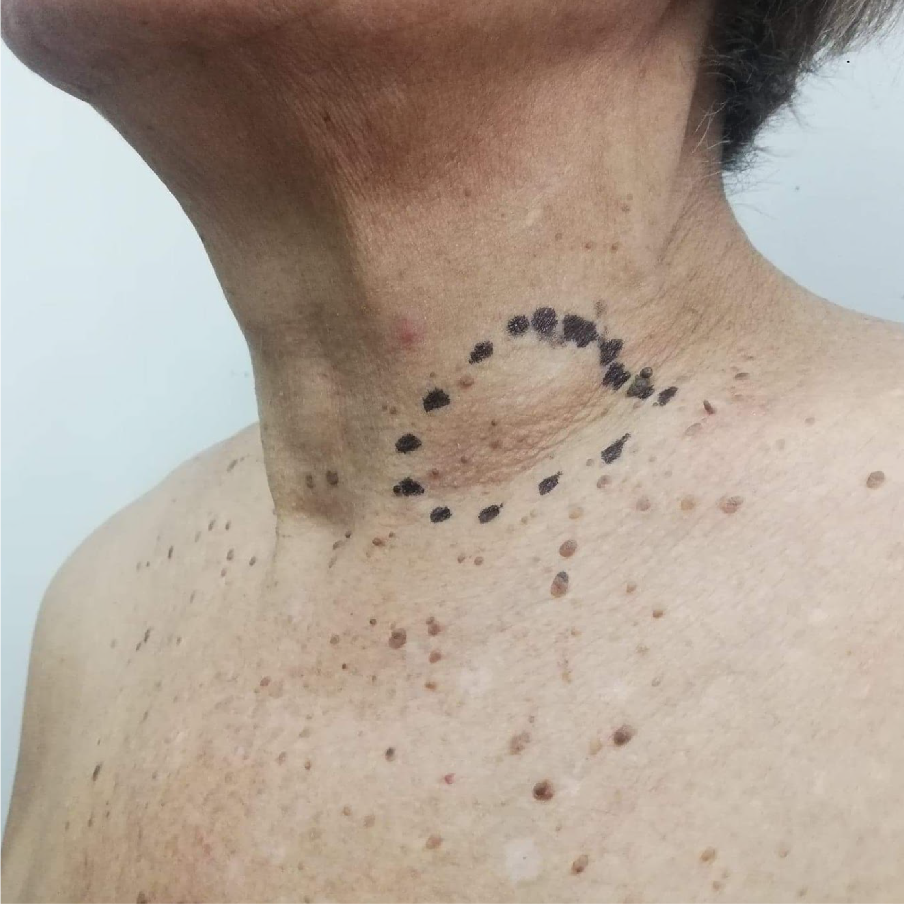 The patient had an unremarkable course postoperatively and was discharged four days after the excision of the anal mass. Ten days after the surgery, we noted good healing in the surgical site with no bleeding. A month after the surgery, the patient reported to have been able to sit, defecate, and perform other activities of daily living without difficulty. Four months after the surgery, the patient reported minimal bleeding near the surgical site, and we noted another hyperpigmented nodular lesion measuring 1 x 1 cm in size on the anal verge. The patient did not report any symptoms referable to the anterior neck mass, but she pointed out a new-onset, 2 x 2- cm, palpable, firm, and movable breast mass located at the upper inner quadrant of her right breast. We could not palpate any axillary or clavicular nodes on examination. We apprised the patient of the poor prognosis of her recurrent anal mass and the possibility of having more metastases to the other parts of her body. We also told her about the possibility of a second excision procedure in the near future if intractable bleeding from the new-onset anal mass ensues. She was then lost to follow up. Six months after her last follow up, her family informed us about her death at home.