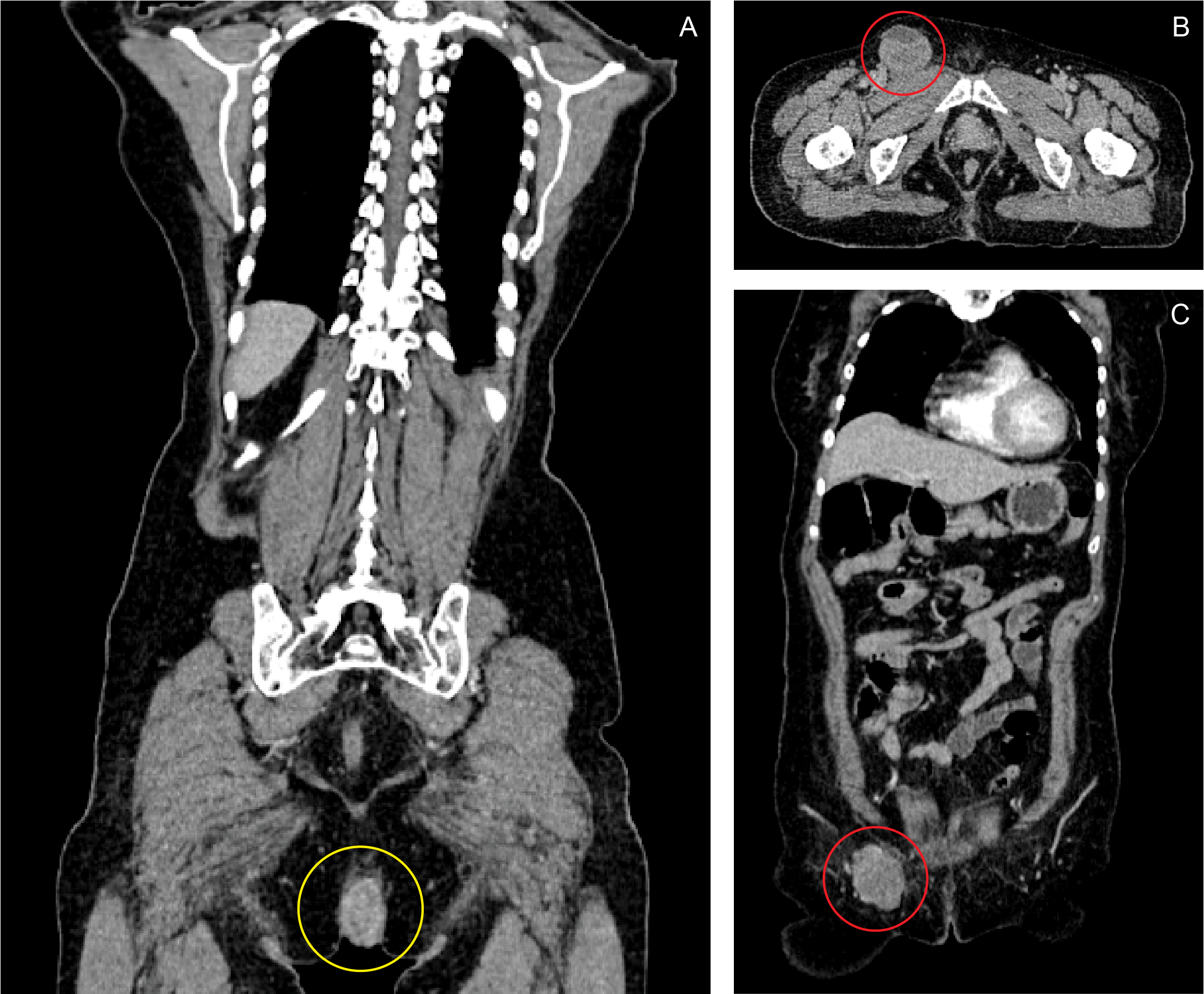 Coronal (A, C) and axial (B) views of contrast CT scan of the whole abdomen. A fairly-defined, heterogeneously-enhancing, fungating mass, measuring 5.40 x 3.14 x 5.81 cm, is seen in the anal region, infiltrating the puborectalis muscle, anal sphincter and perineal muscles (A: yellow ring). A second, well-defined, lobulated, enhancing, hypodense mass measuring 5.29 x 4.58 x 4.33 cm is also noted at the right inguinal area (B, C: red ring).