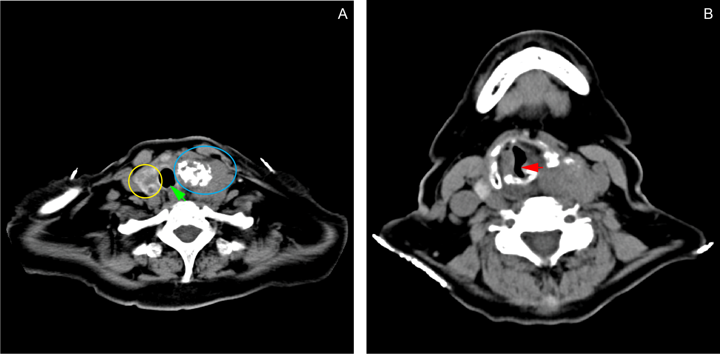 Contrast chest CT scan showing a fairly-defined, heterogeneously-enhancing lesion (4.41 x 5.31 x 3.89 cm) with internal coarse calcifications seen in the left thyroid lobe (A: blue ring). Soft tissue extension from the thyroid gland into the trachea causes narrowing of the airway at the level of T1 (B: red arrow). The mass also deviates the trachea to the right (A: green arrow). The right thyroid lobe contains multiple subcentimeter, hypodense, non-enhancing, non-calcified lesions (A: yellow ring).