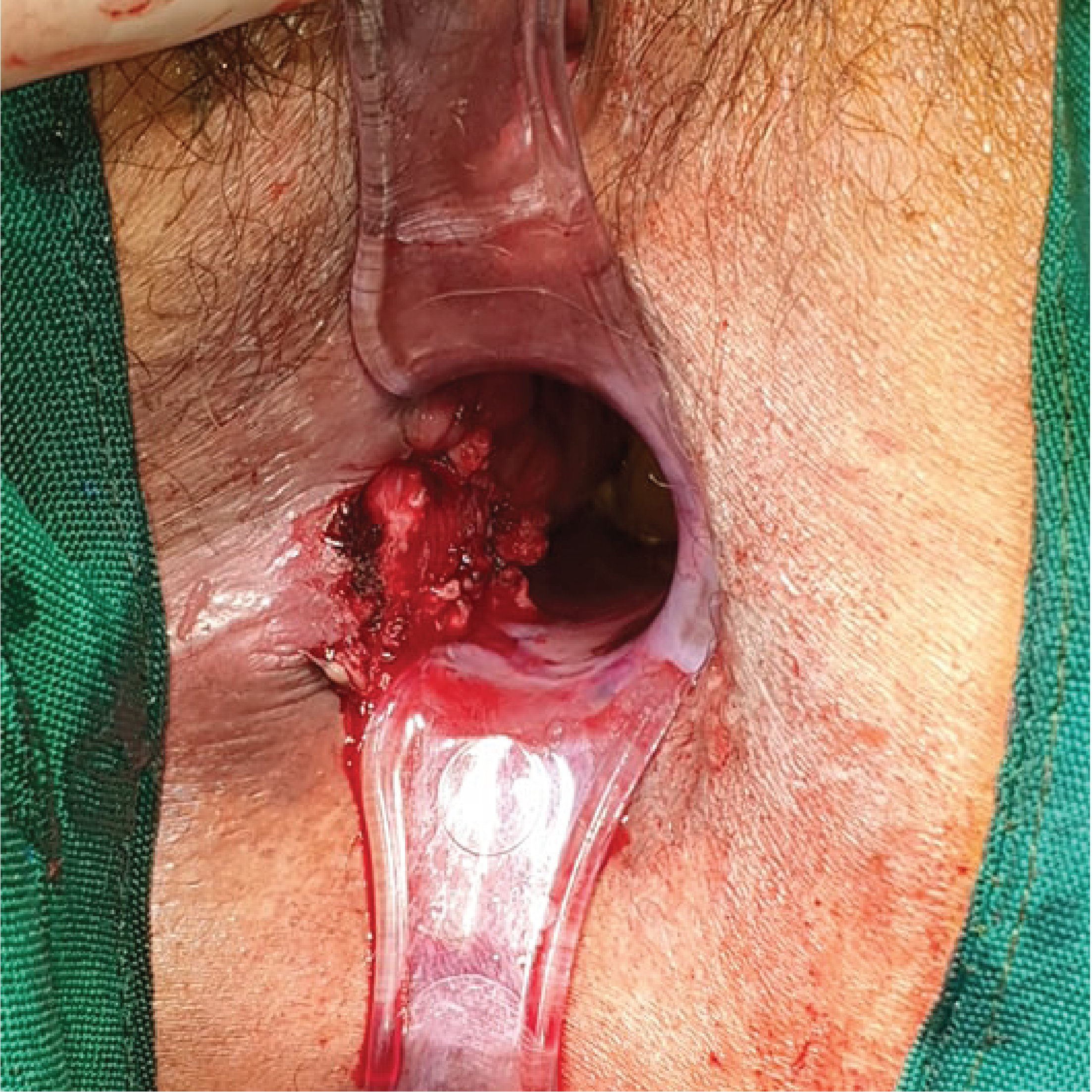 Postoperative view of the patient’s anal orifice after excision of the anal and inguinal masses, with exposure of the base of the pedunculated anal mass at posterolateral right aspect of the anal canal.