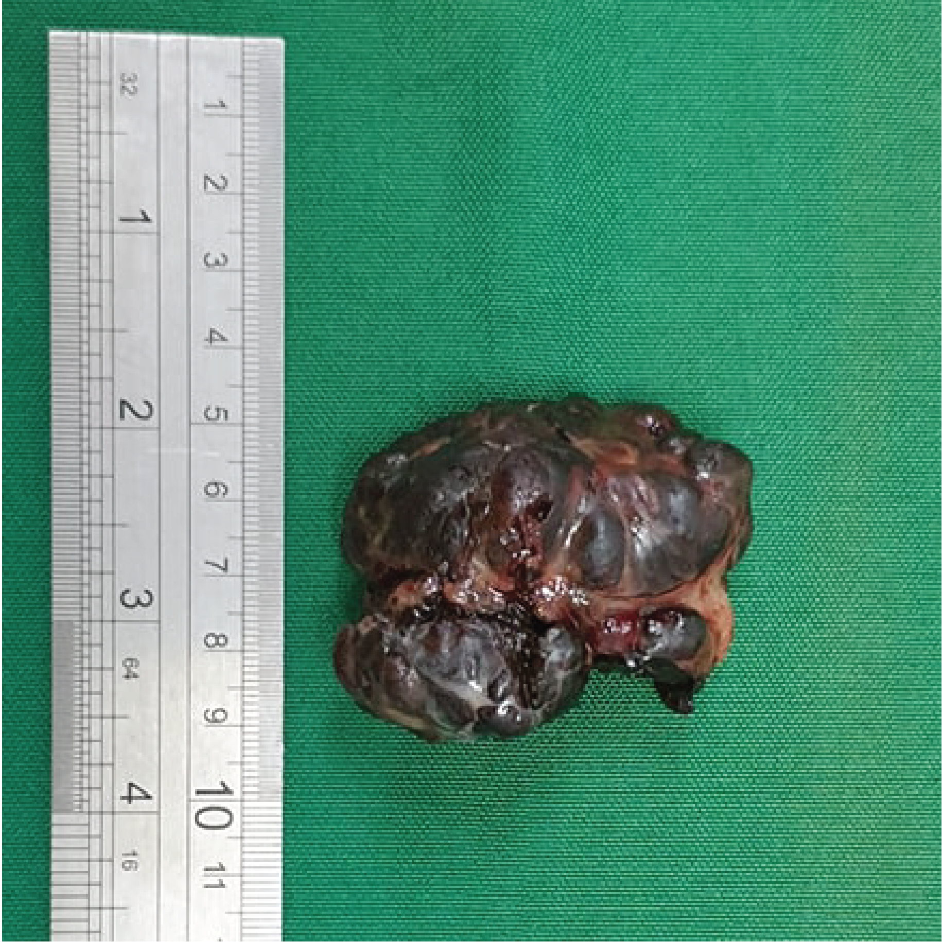 Gross image of the anal lesion after excision. The fleshy black polypoid mass measures  5 x 4 x 3 cm.